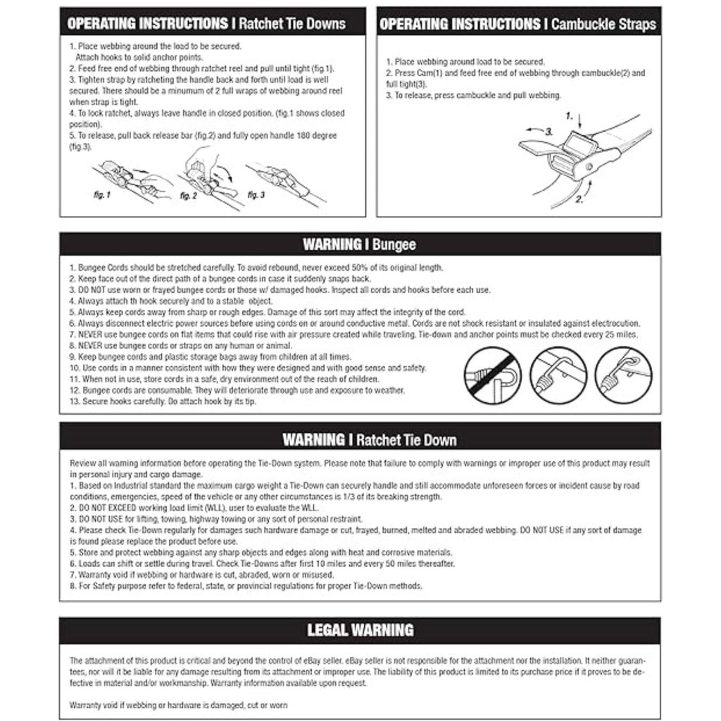 - إرشادات السلامة: تأكد من محاذاة الخطافات والأبازيم مع اتجاه السحب. تجنب ملامسة الأشياء الحادة والأسطح الساخنة والمواد الكيميائية. افحص الأشرطة بحثًا عن أي تآكل قبل كل استخدام.