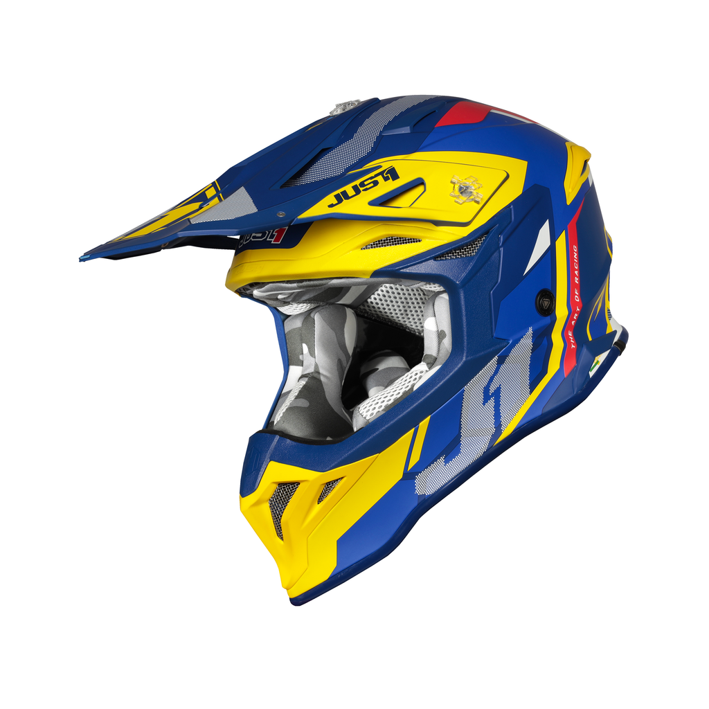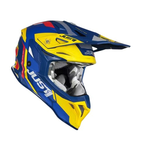 خوذة الدراجة النارية JUST1 J39 رياكتور موتوكروس باللون الأصفر والأزرق المطفي : مزيج مثالي من الأناقة والسلامة