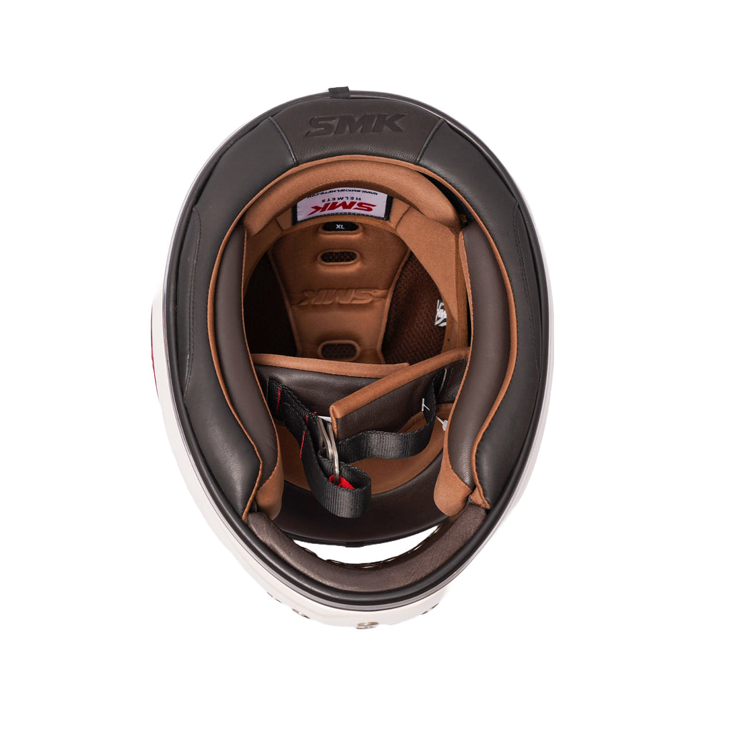 تمزج خوذة SMK Retro Solid Full‑Face ذات اللون الأبيض GL‑130 بين الجماليات الكلاسيكية الخالدة وخصائص السلامة الحديثة - وتتميز بشهادة DOT وECE، وبطانة جلدية مريحة، وقناع Pinlock جاهز، وألواح جانبية قابلة للتخصيص.